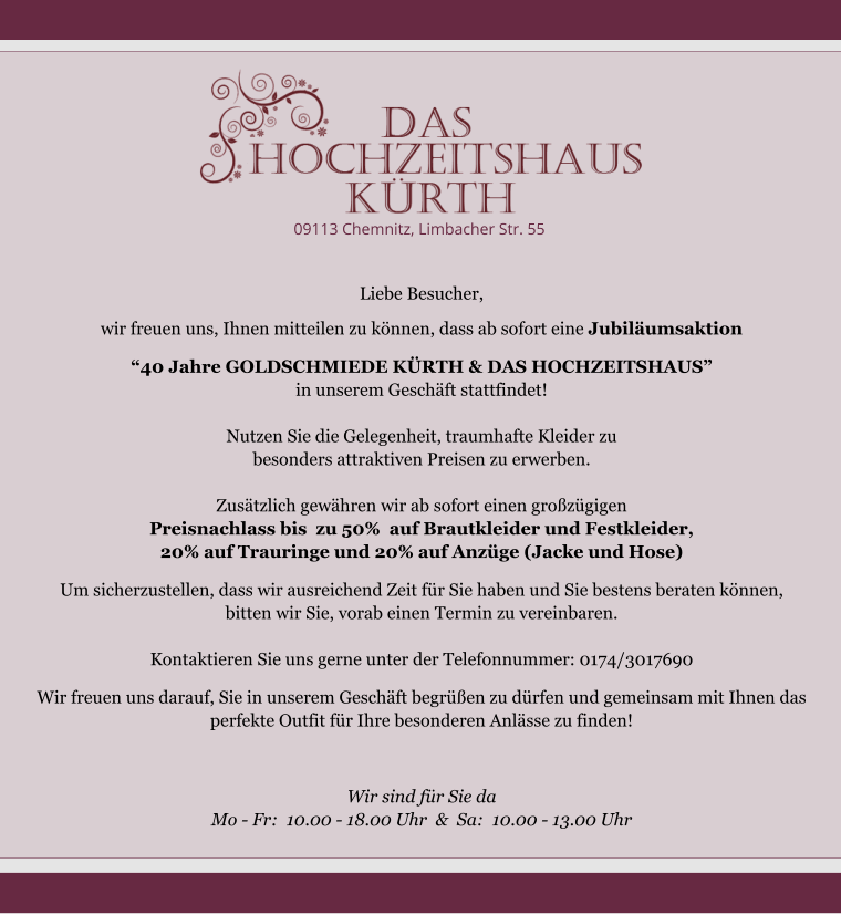 Hallo und herzlich Willkommen im CHEMNITZER HOCHZEITSHAUS KÜRTH Ich freue mich, Sie als Kunde begrüßen zu dürfen. Mein Name ist Annette Kürth und ich bin die Inhaberin des Hochzeitshauses.